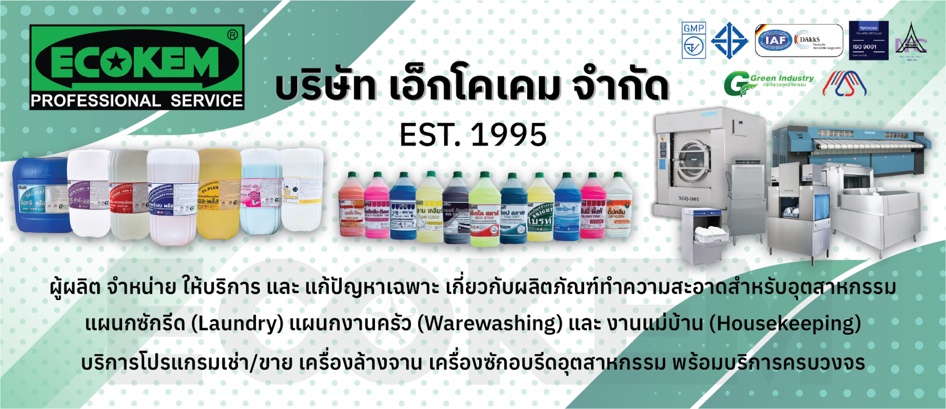 ผู้ผลิต จำหน่าย และ ให้บริการแก้ปัญหาเฉพาะ เกี่ยวกับผลิตภัณฑ์ทำความสะอาดระดับอุตสาหกรรม เช่น โรงพยาบาล โรงแรม โรงงาน โรงเรียน ร้านอาหาร ห้างสรรพสินค้า อาคารพาณิชย์ เป็นต้น โดยให้บริการในแผนก ซักรีด งานครัว และ งานแม่บ้าน พร้อมทั้งโปรแกรมเช่า/ขาย เครื่องล้างจาน เครื่องซักผ้า พร้อมบริการหลังการขายครบวงจร รวมถึงการรับผลิตสินค้า (OEM) เคมีภัณฑ์ให้แก่แบรนด์ชั้นนำ