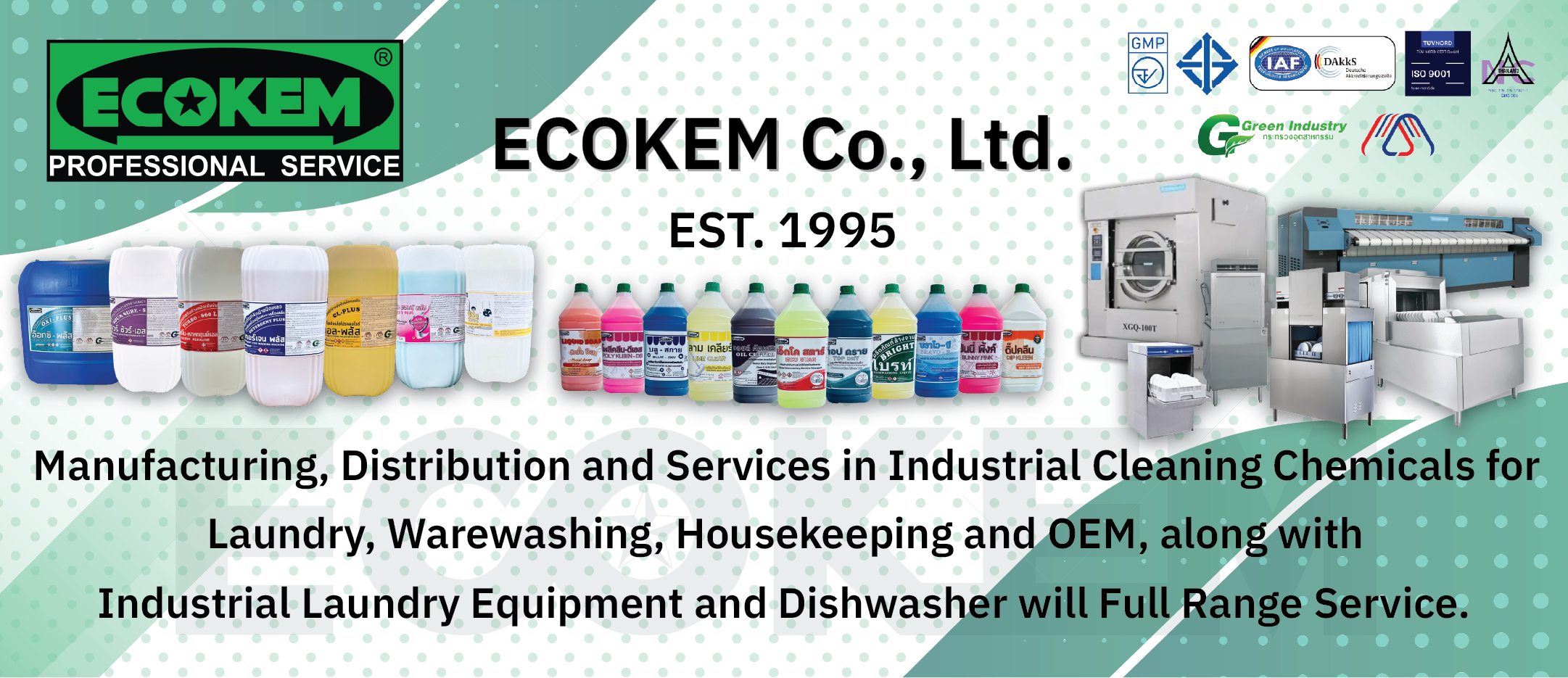 ECOKEM Co., Ltd. have been certified of good manufacturing practice (GMP) by Thai FDA and also operating according to ISO 9001:2015 standard for manufacturing and distribution of cleaning chemical products and disinfectant with installation and services of industrial laundry system and dishwasher.